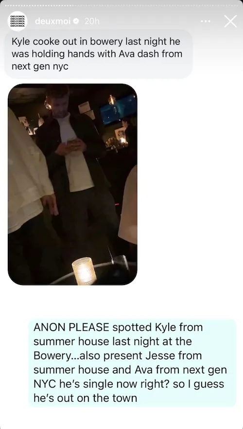 “[I] spotted Kyle from Summer House last night at the Bowery … also present Jesse from Summer House and Ava from Next Gen NYC he’s single now right? So I guess he’s out on the town.”