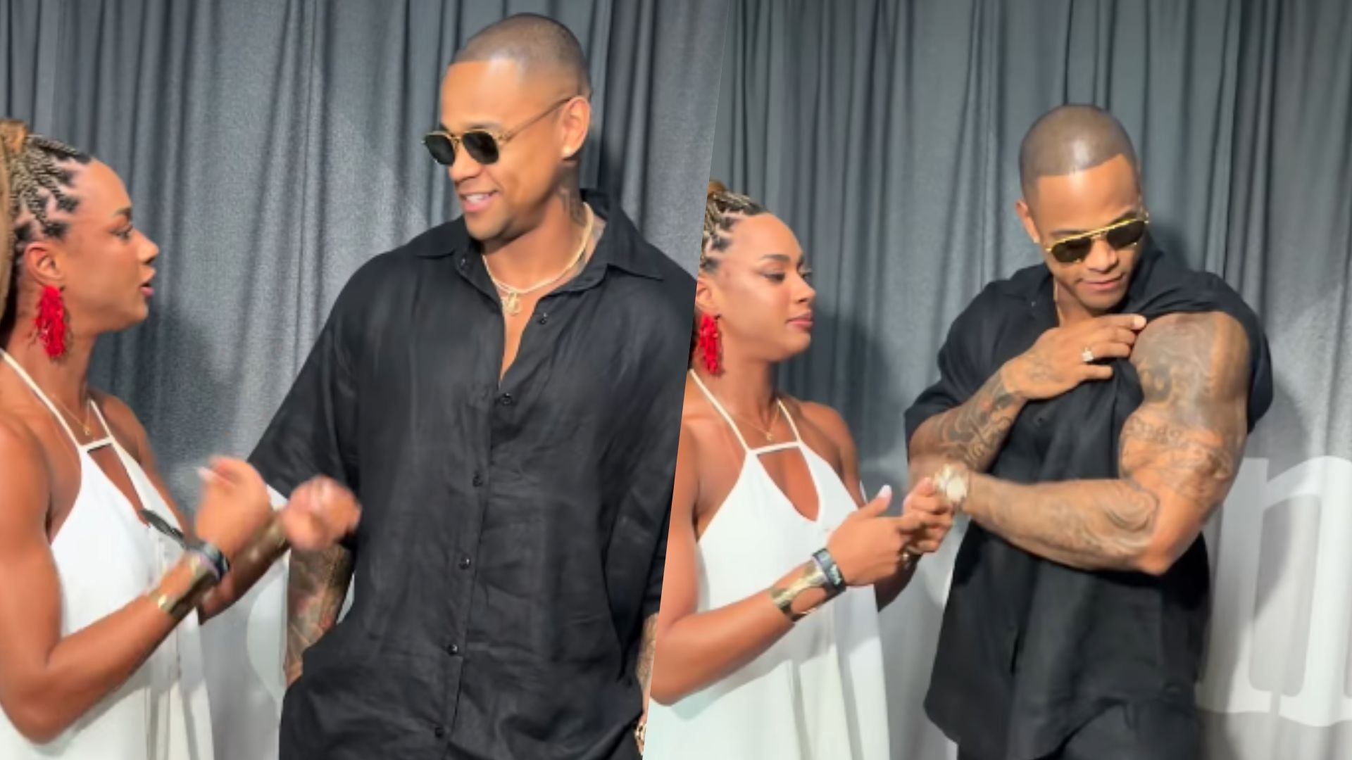 No mesmo evento, o enfermeiro do BBB 23 também fez uma gravação de bastidores com o marido de Lore Improta. Ele brincou com a diferença de altura entre os dois baianos.