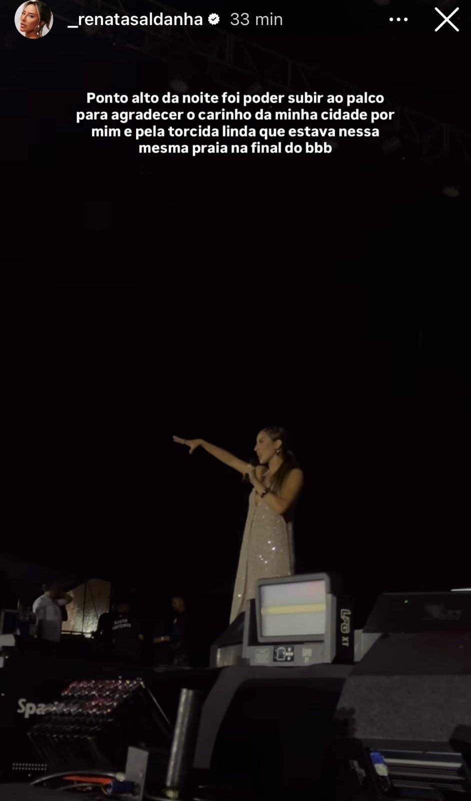 Renata Saldanha, campeã do BBB 25, passou a virada do ano na praia de Iracema, em Fortaleza. Nas redes sociais, a bailarina compartilhou o momento em que subiu no palco para agradecer o carinho do público. Durante o discurso, a ex-sister relembrou a surpresa com o tamanho da sua torcida, no dia da Final do programa.