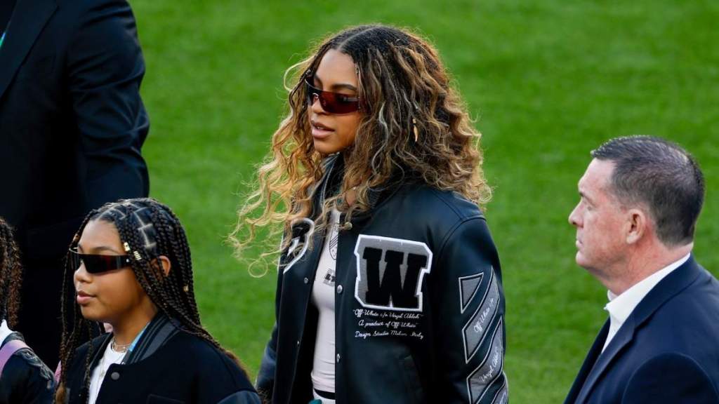 Blue Ivy was photographed alongside her family amid pre-game activity. By pairing a high-value Off-White varsity jacket with relaxed basics, she delivered a Super Bowl look that felt effortless yet considered. The appearance highlighted how luxury streetwear continues to move seamlessly into everyday settings, even on one of the world’s largest sporting stages.
