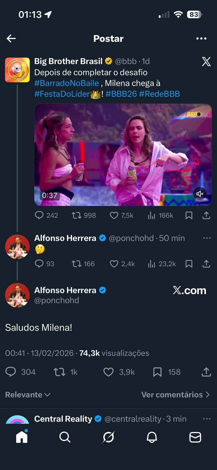 Alfonso Herrera, ex-integrante do RBD reagiu a um vídeo de Milena no BBB 26. Nas redes sociais, o ator escreveu "Saludos Milena" e republicou o vídeo da sister.