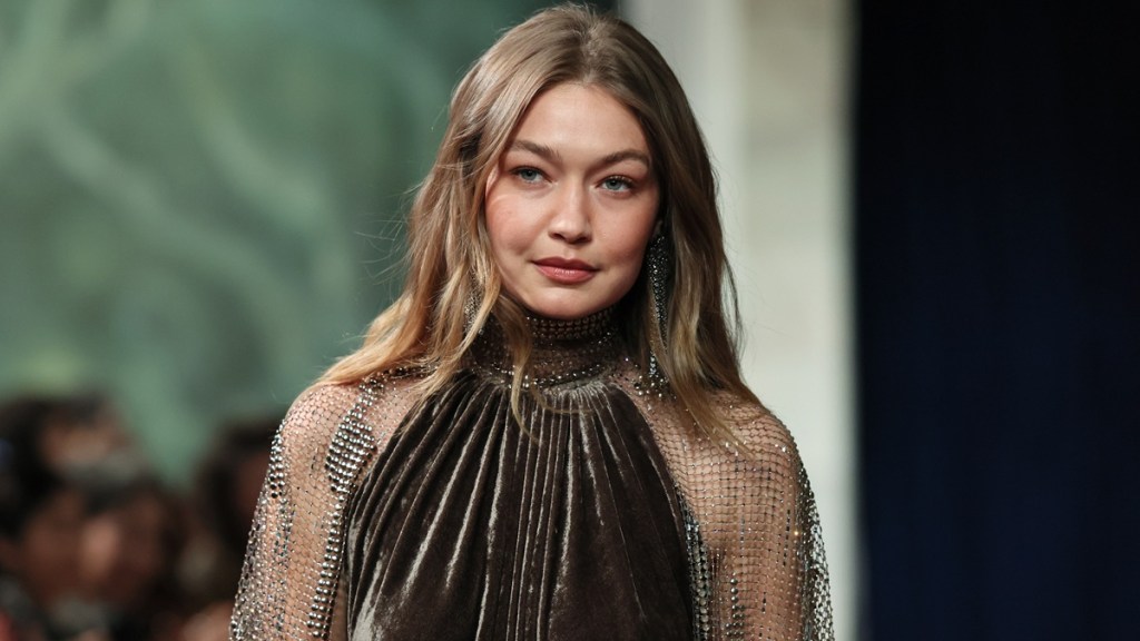 Gigi Hadid walks runway in Ralph Lauren’s velvet maxi dress with sheer chainmail addition