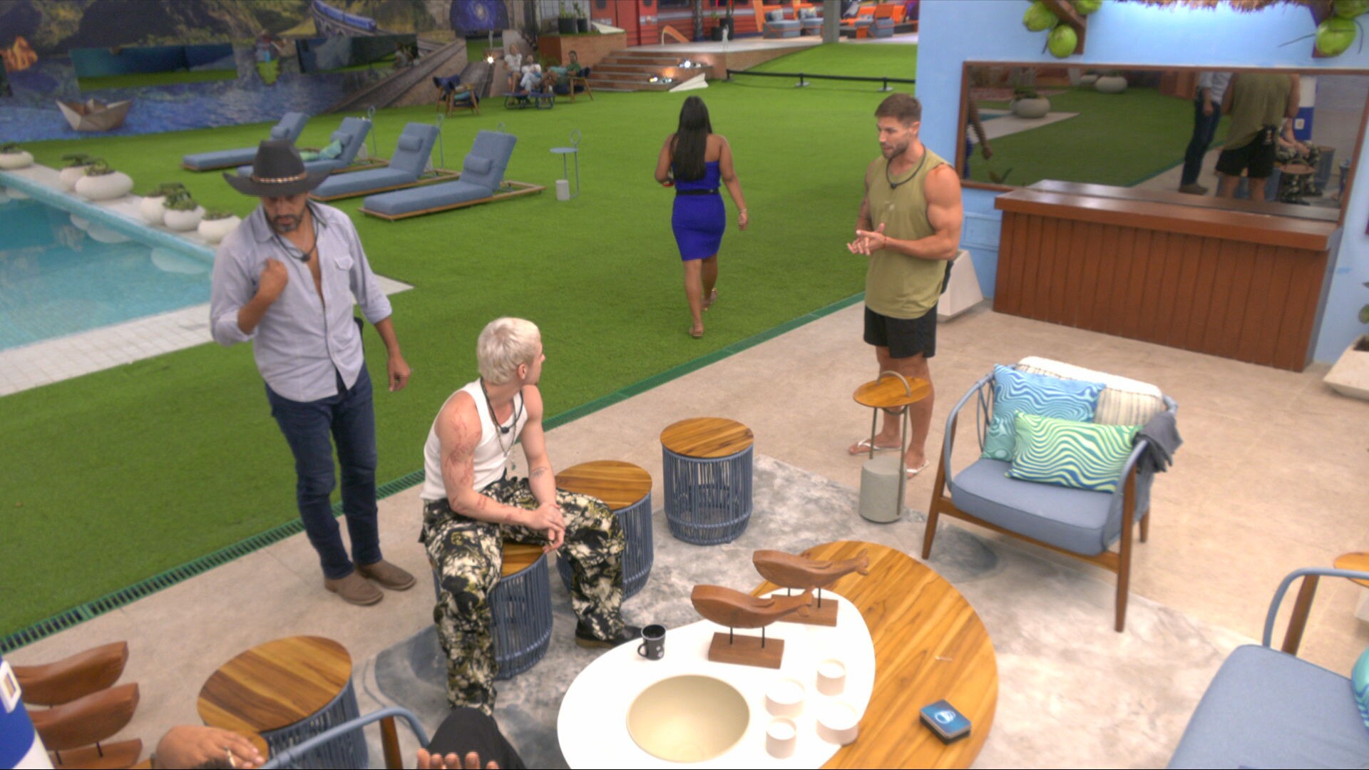 "Fiquei três dias virado para pegar o Big Fone", afirma o Camarote. "Não valeu nem a pena", rebate o Veterano, que se livrou na Prova Bate e Volta. "Tudo bem, é dinâmica do jogo", responde o dançarino.