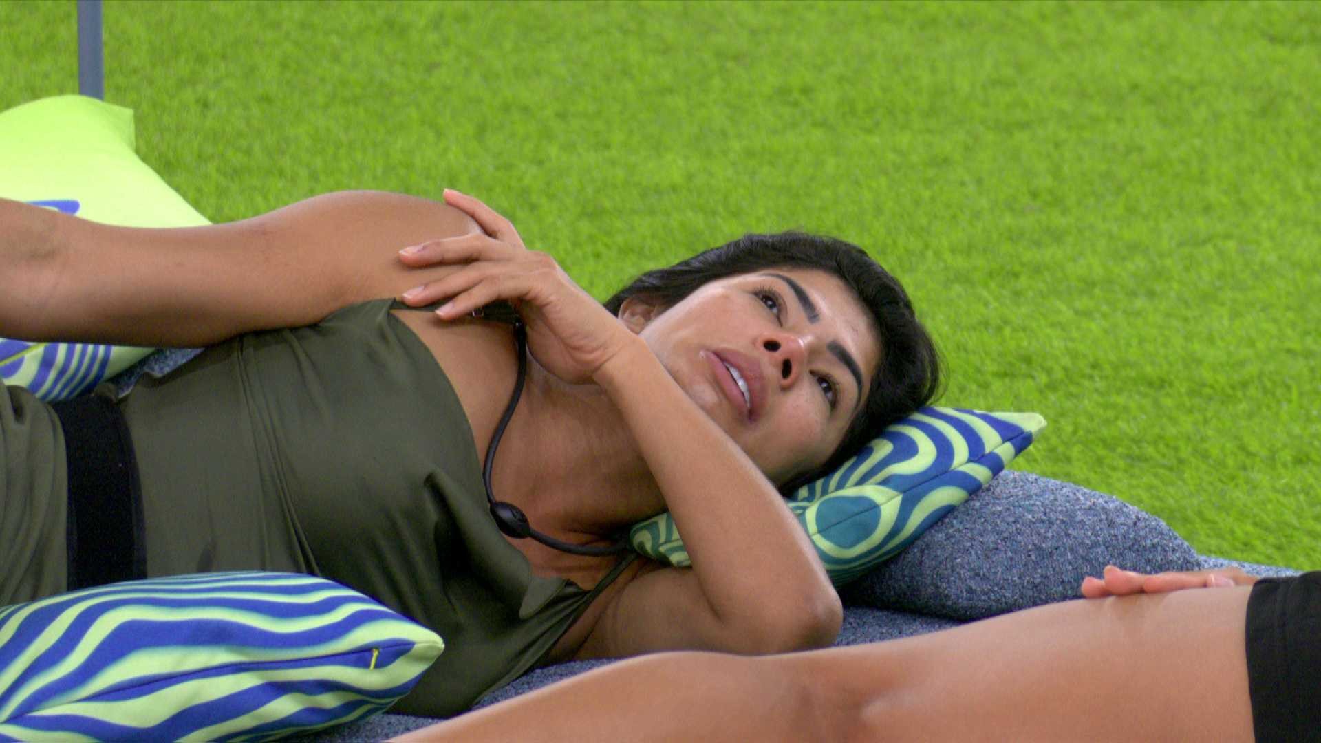 "Tenho muito medo das pessoas acharem que a gente tá completamente do lado daqui. Essa é uma preocupação minha, porque a gente não tá. A gente tem uma parceira muito fiel, mas nossos objetivos tão alinhados com os deles", diz a paraense, fazendo referência ao grupo do qual Jonas Sulzbach faz parte. O brother está na espreguiçadeira ao lado delas.