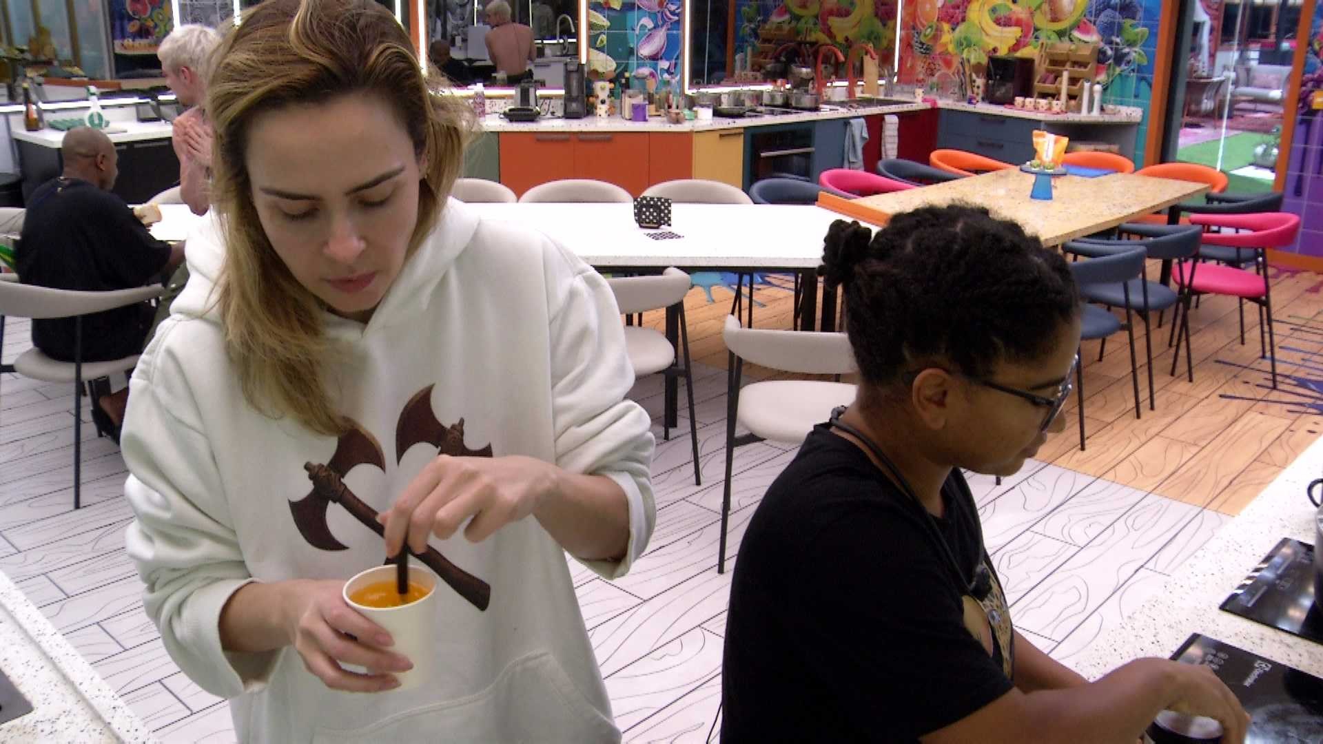 "Não fala assim, não, que você sabe que ele gosta de você", a Veterana retruca. "Não quero mais que ele goste de mim, não. Desse jeito, não. É igual me apoiar quando não tem ninguém perto. Entendeu?", Milena reflete.