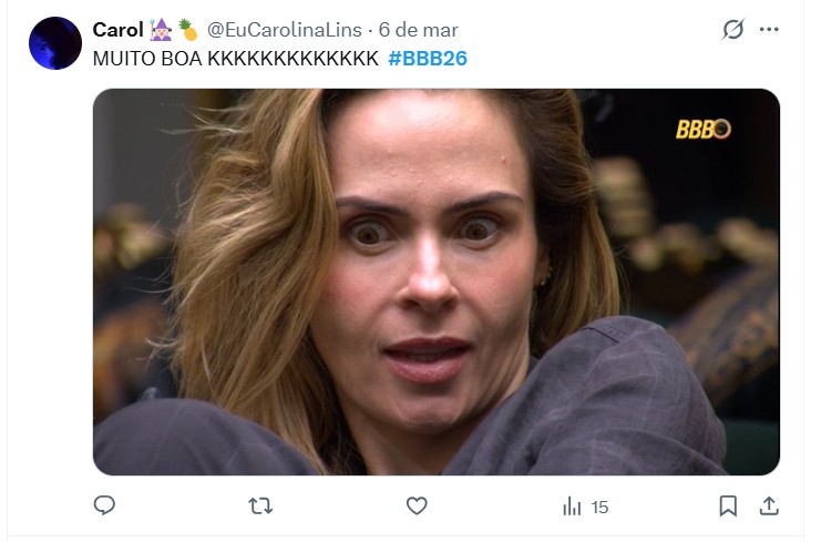 A modelo do Centro-Oeste pensa quem teria mais posicionamento com a possível eliminação da jornalista ou do ator. "Quem mais teria personalidade ali que eu acho é o Breno", opina.
