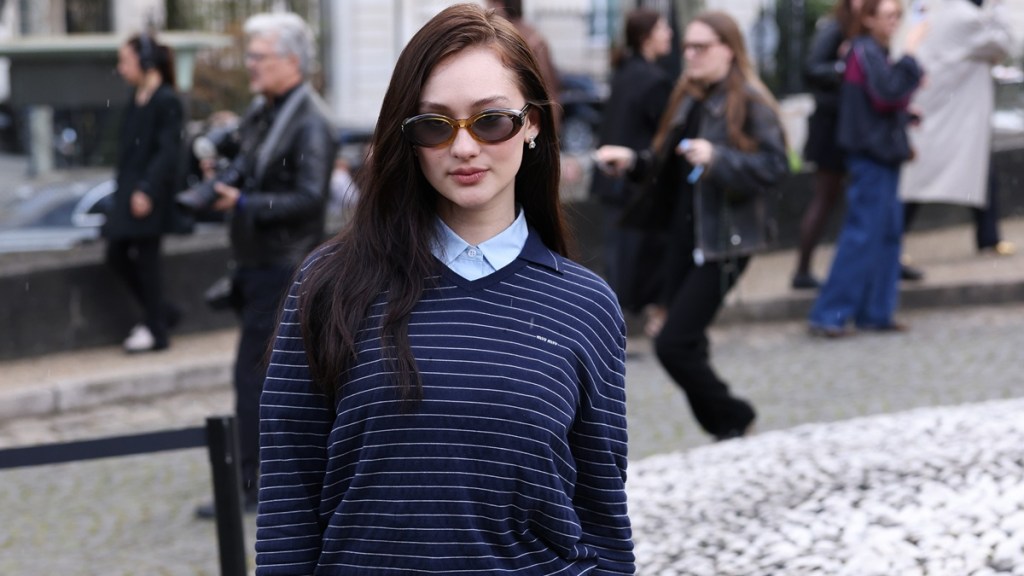 The renowned model rocked an outfit that exuded perfect street-style vibes at PFW. She wore a light blue collared shirt and layered it with a navy-striped knit sweater.